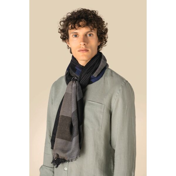 100% viscose. Geweven tulbanddoek met franjes. Dubbelzijdige, omkeerbare stof: één kant met contrasterende ruitjes, de andere met grotere ruiten in beige, blauwe en grijze tinten. Onze tulbanddoeken zijn ambachtelijk geweven en kunnen daarom kleine kleurverschillen vertonen, wat een teken is van authentiek vakmanschap.