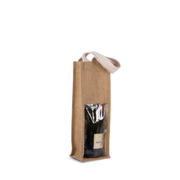 Flessentas van jutecanvas, met 2 hengsels en een transparant venster vooraan. Voor 1 fles.