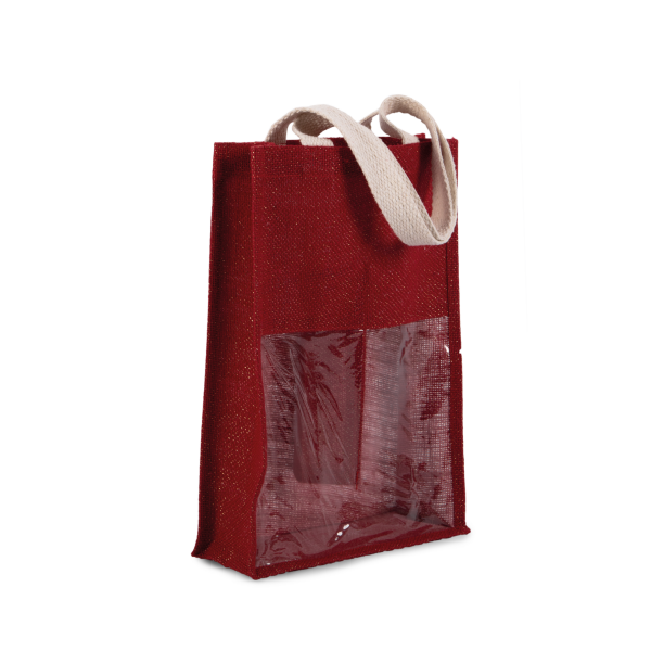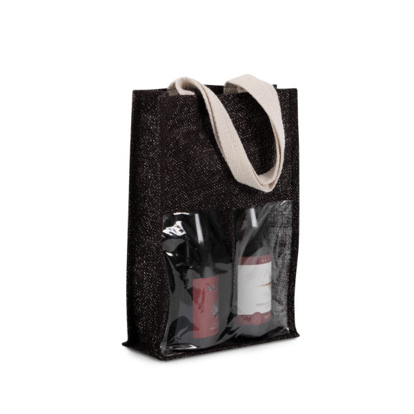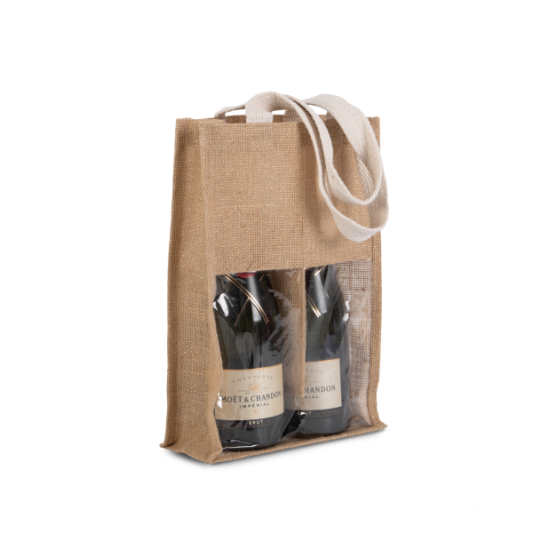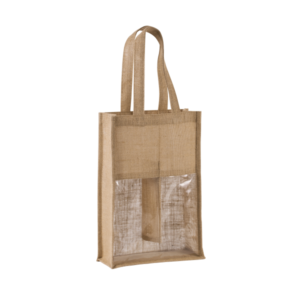 Flessentas van jutecanvas, met 2 hengsels en een transparant venster vooraan. Voor 2 flessen.