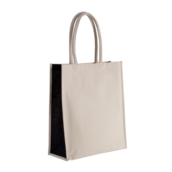 Shopper van canvaskatoen en contrasterende inzetstukken van jutecanvas aan de zijkant. Katoenen hengsels van 55 cm in ecru.