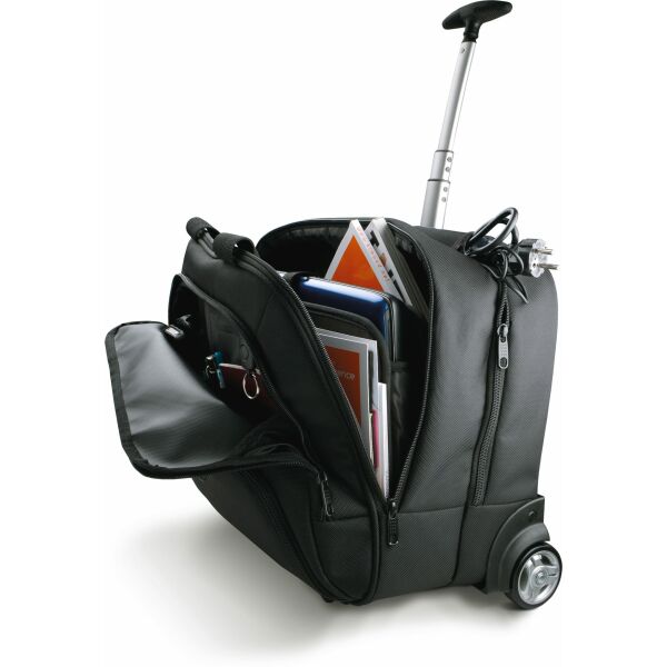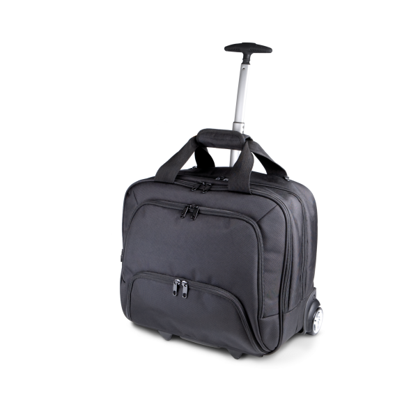 Laptop trolley van 1680D polyester, geoxideerde aluminium trekstang, 2 hoofdvakken, een vak voor laptop tot 15" en een vak voor documenten en/of kleding voor een overnachting , 2 voorvakken waarvan een met organizer voor laptop accessories, sleutelring, band op rugzijde om de tas op een trekstang te kunnen bevestigen.