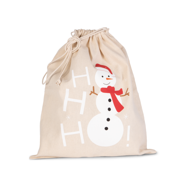 220 g/m² 100% katoen. Katoenen tas met trekkoord en gedrukte sneeuwpop. 38x45cm.